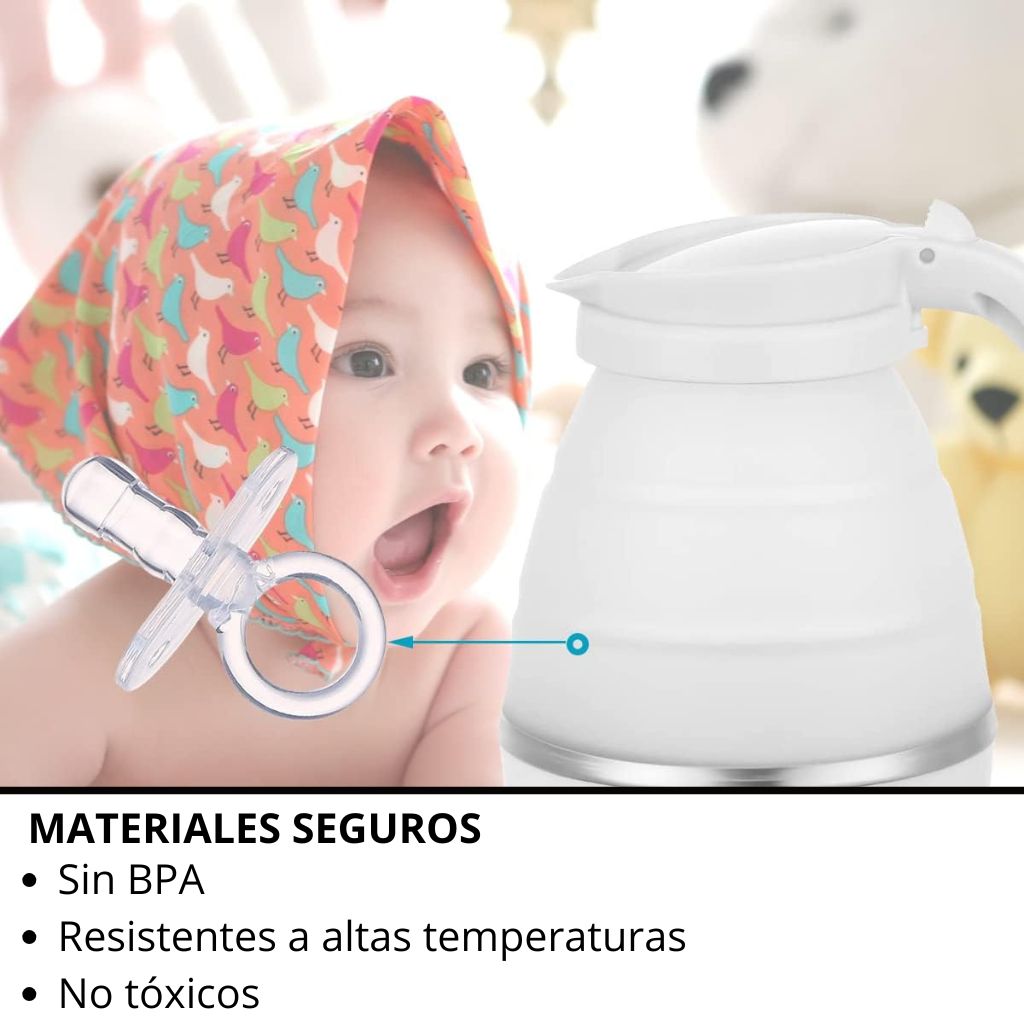 Nuestra pava eléctrica portátil está fabricada con silicona sin BPA (como la que se usa para los chupetes) y acero inoxidable de grado alimenticio. Estos materiales son seguros para el contacto con alimentos y presentan una buena resistencia a las altas temperaturas, por lo que mantienen la estabilidad estructural.